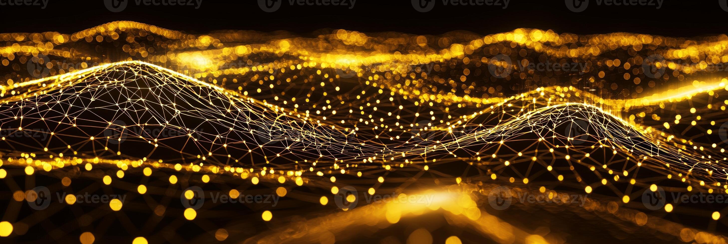 Golden particles weave together to form an intricate geometric pattern, glowing softly against a dark background, creating a mesmerizing web-like structure emphasizing high-tech aesthetics. Pro Photo
