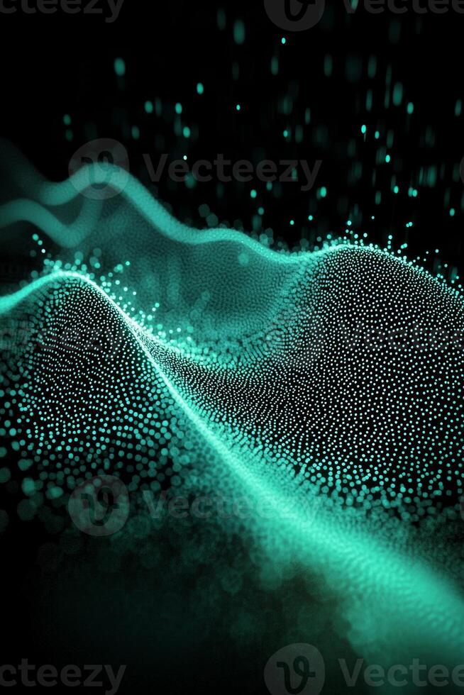 Turquoise particles ripple in a wave-like motion against a dark backdrop, creating a sense of cosmic tranquility. The blurred particles suggest fluid movement in a minimalist aesthetic. Pro Photo