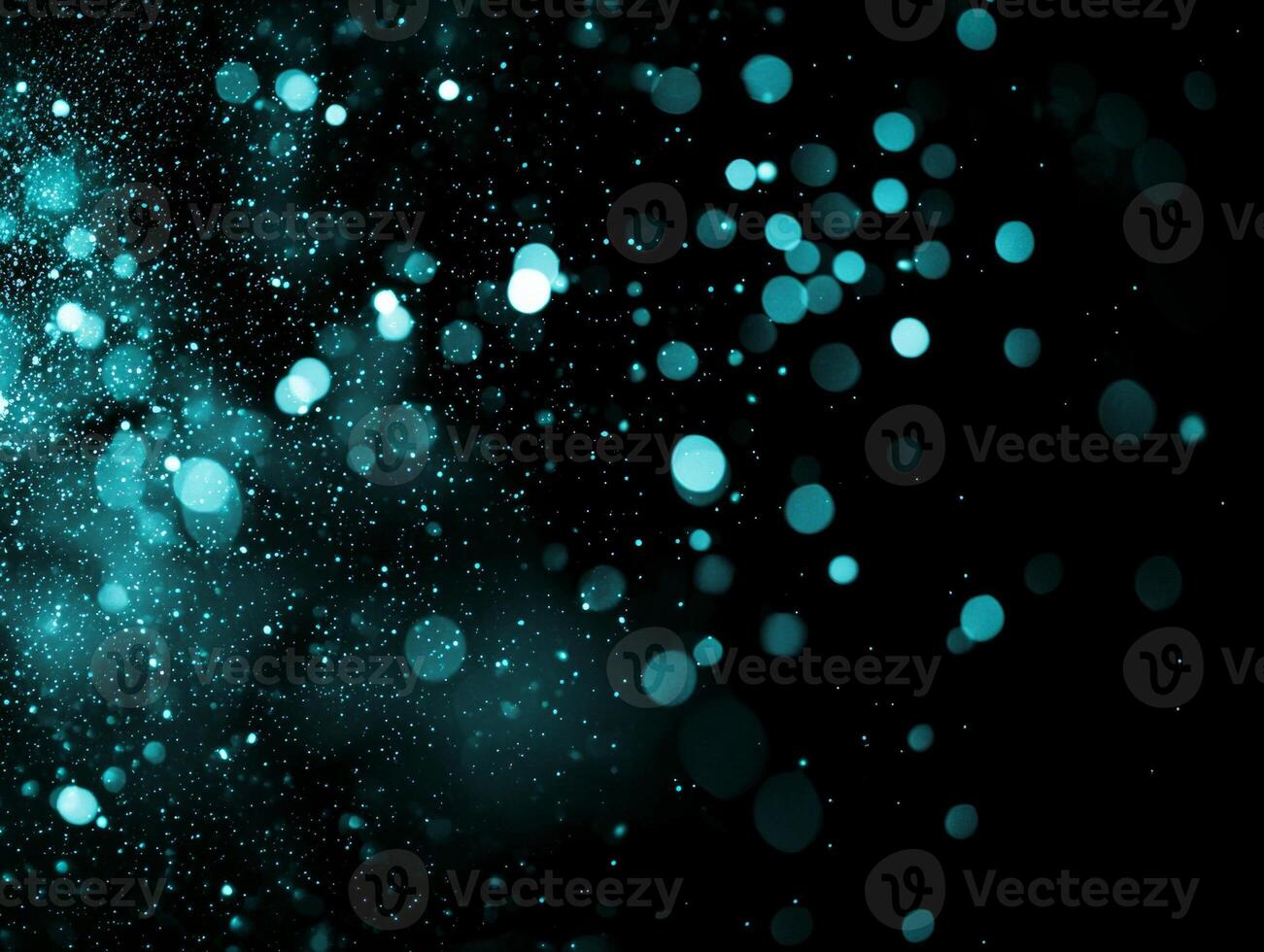 Turquoise particles scatter chaotically across a deep black background, glowing in varying intensities to create a mesmerizing stardust effect reminiscent of the cosmos. Pro Photo