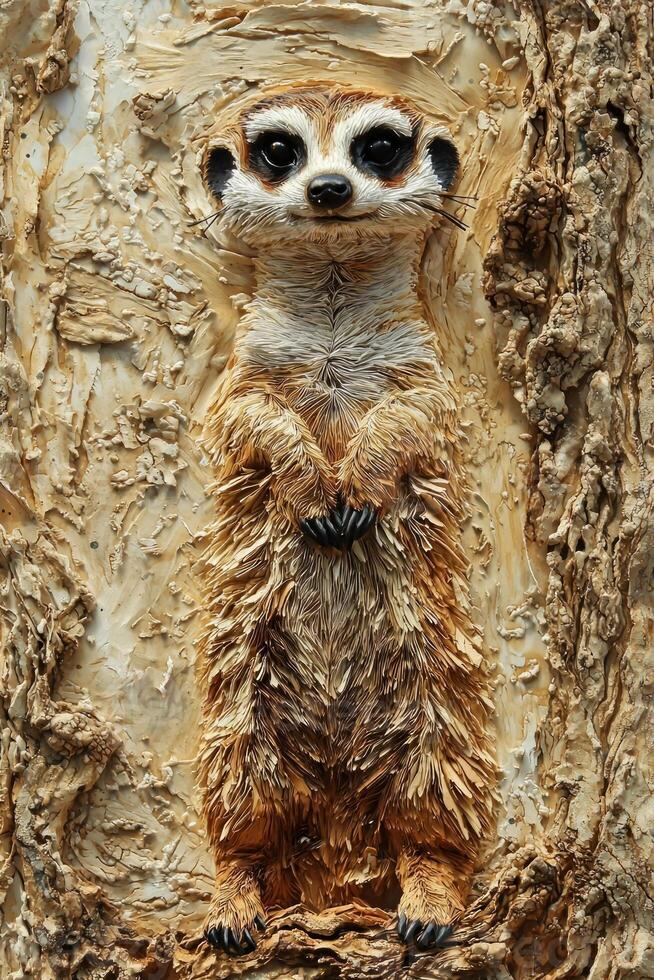delightful meerkat stands alert, crafted from textured layers of tan and brown paper against a light beige backdrop. The whimsical desert elements complement its watchful pose. Pro Photo
