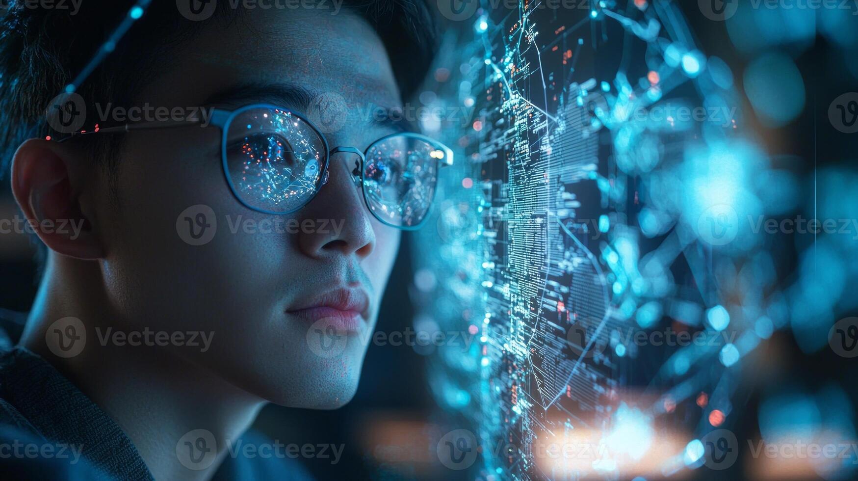 data scientist engages with advanced algorithms presented on a holographic display delving into intricate machine learning processes within a cutting edge laboratory environment. Pro Photo