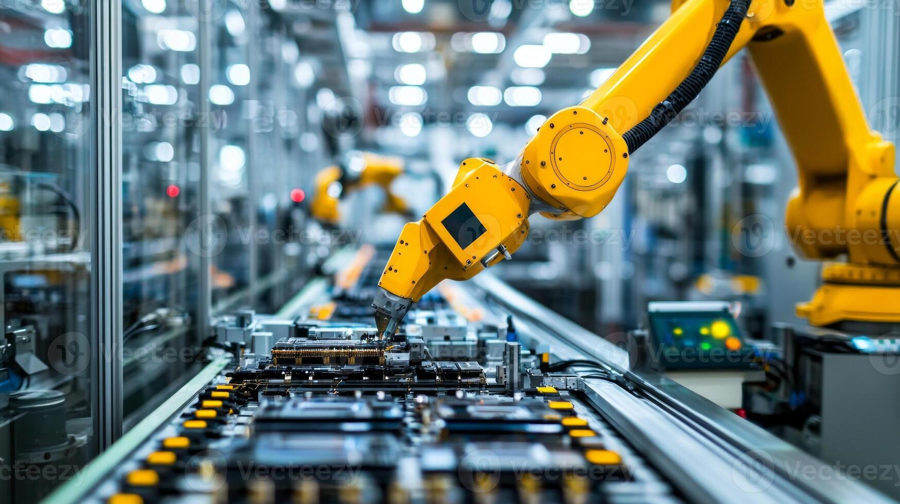 robotic arm expertly assembles electronic components on a cutting edge production line showcasing the efficiency of automation in manufacturing processes. Pro Photo