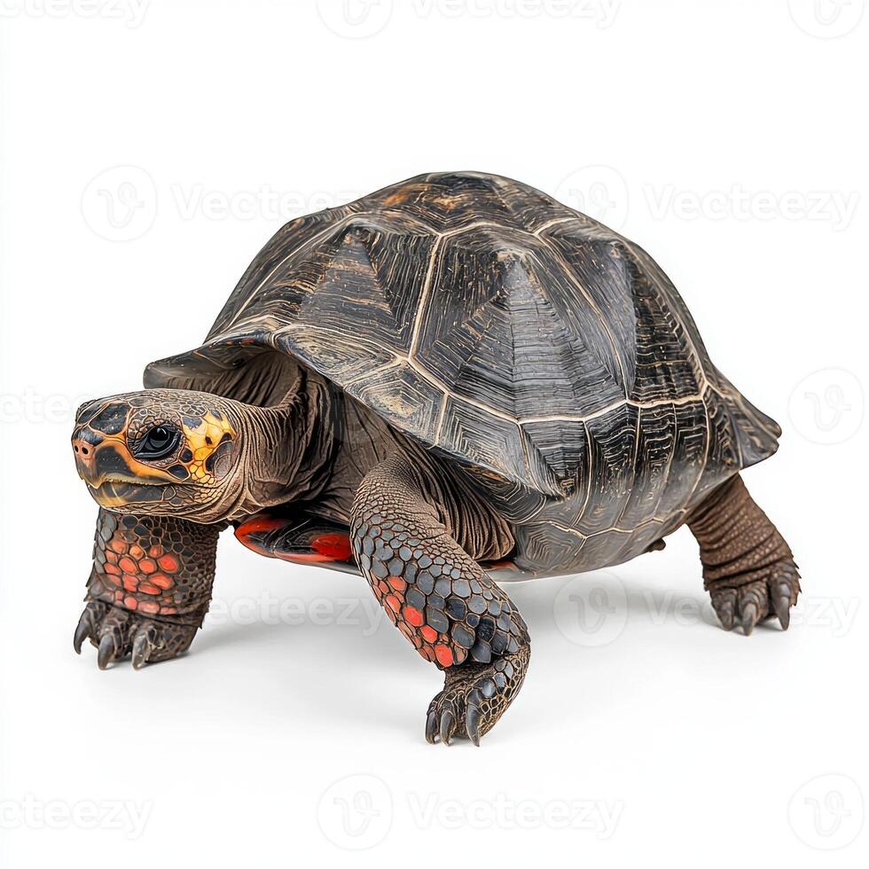 close-up view captures a red-footed tortoise as it walks across a clean surface, highlighting its distinctive shell patterns and striking red markings. Pro Photo