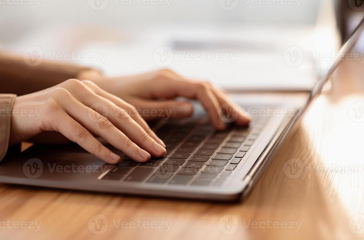 Working At Laptop Pc. Close up image of female hands typing text or programming code using computer at home Pro Photo