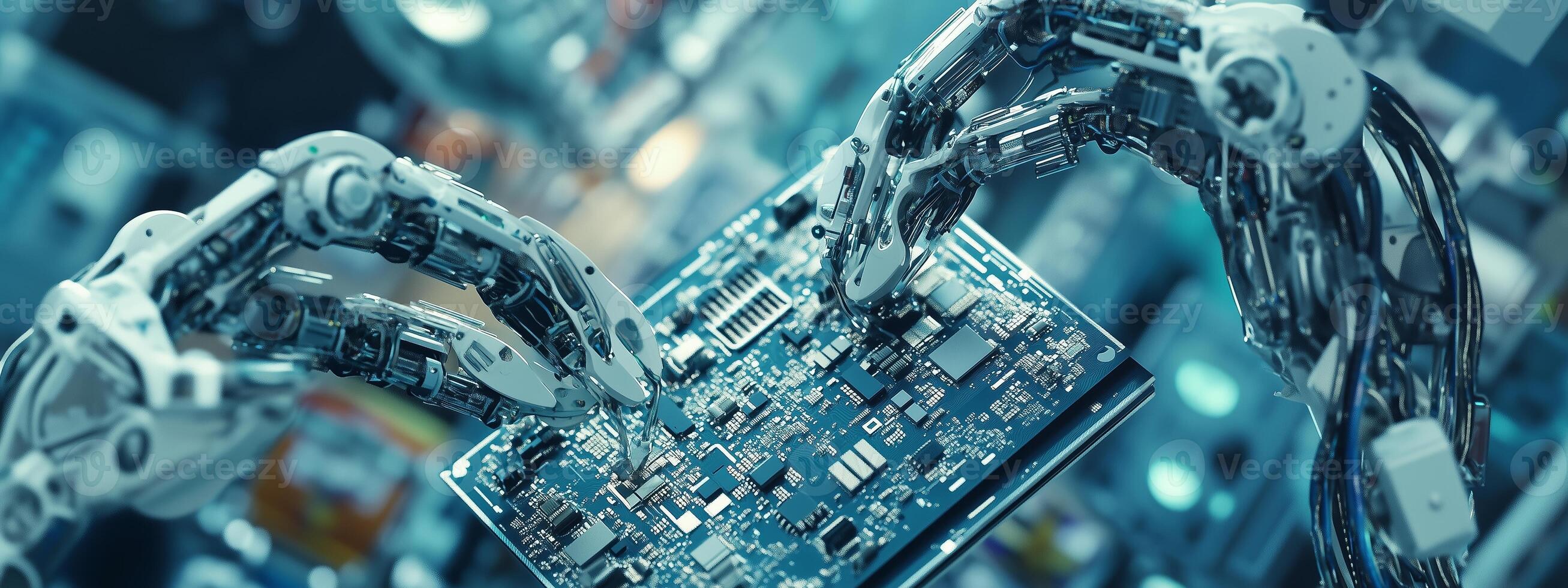 Robotic hands assembling a complex circuit board in a high-tech laboratory environment during the day Pro Photo