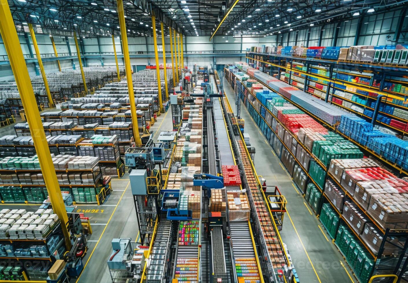 High-angle view of a bustling logistics warehouse with automated sorting systems and organized rows of packaged goods Pro Photo