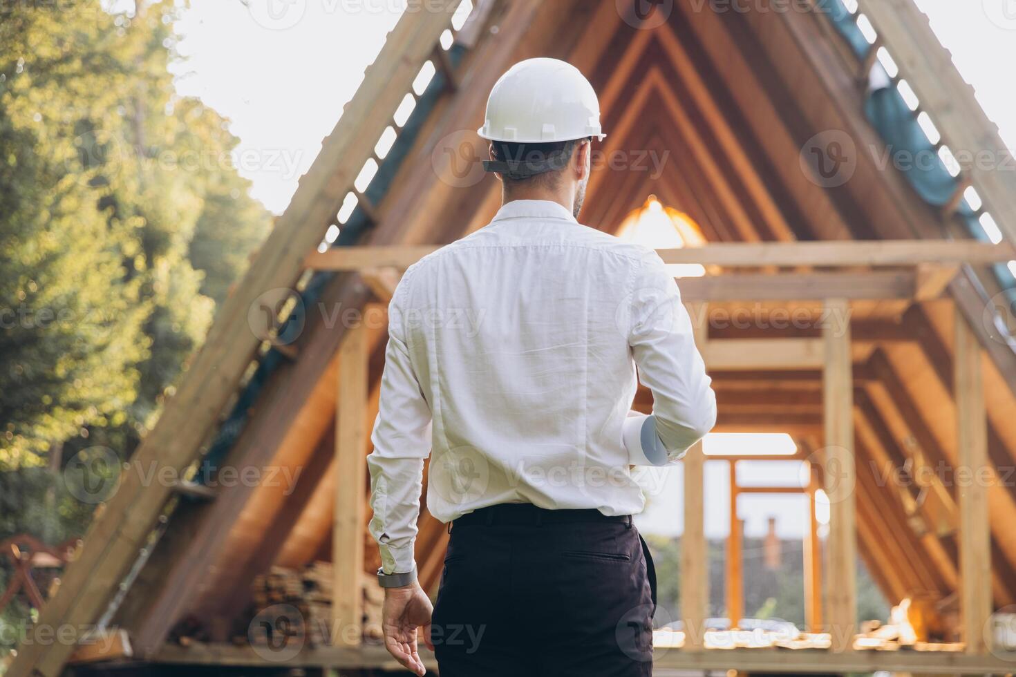 Rear view of construction engineer in white helmet. Developer with construction documentation on the background of wooden modular building under construction. Pro Photo