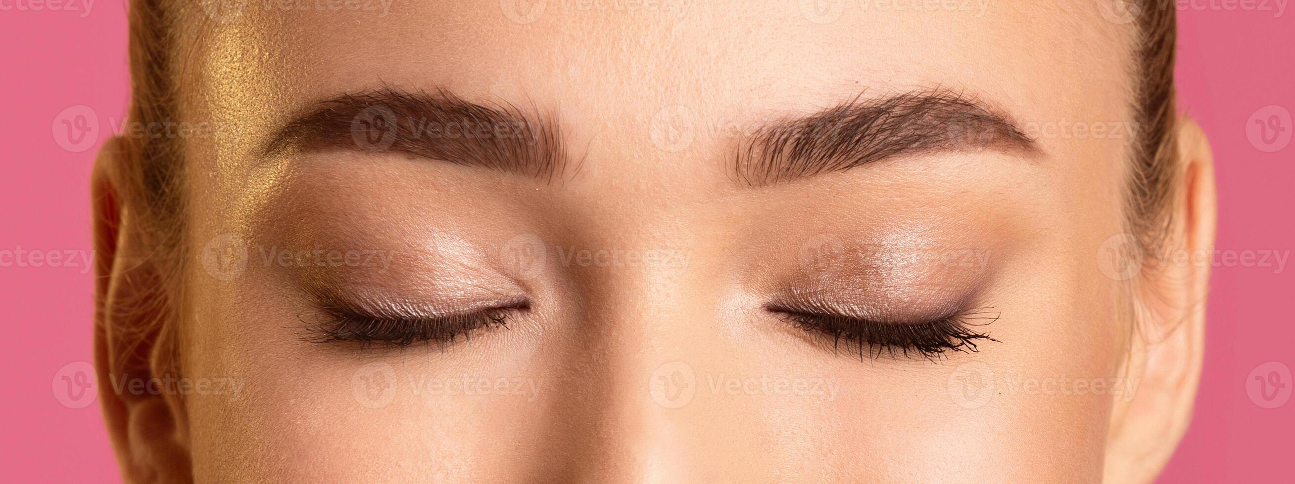 This image shows a close up of a woman eyelids, with defined eyebrows and subtle eye makeup. The photo is taken from a low angle, focusing on the upper eyelids and brow bones. Pro Photo