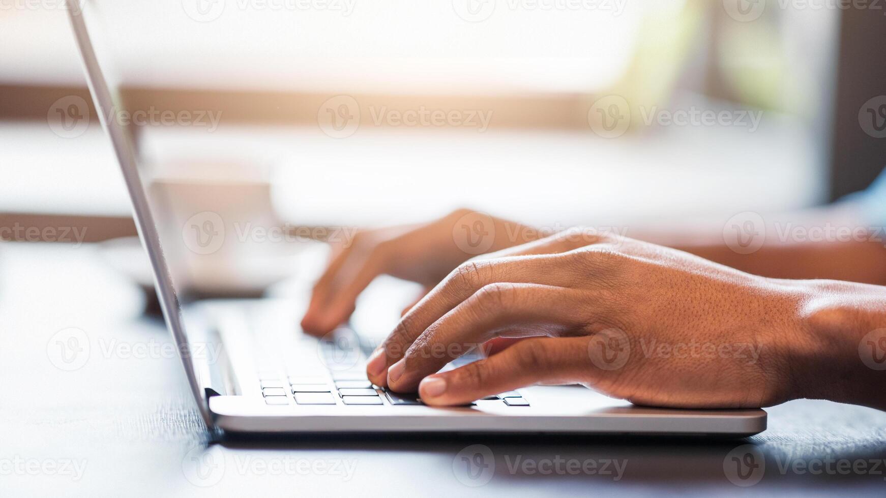 A guy is sitting at a desk, focused on typing on a laptop computer. The screen displays various applications. He appears to be working or communicating online. Pro Photo