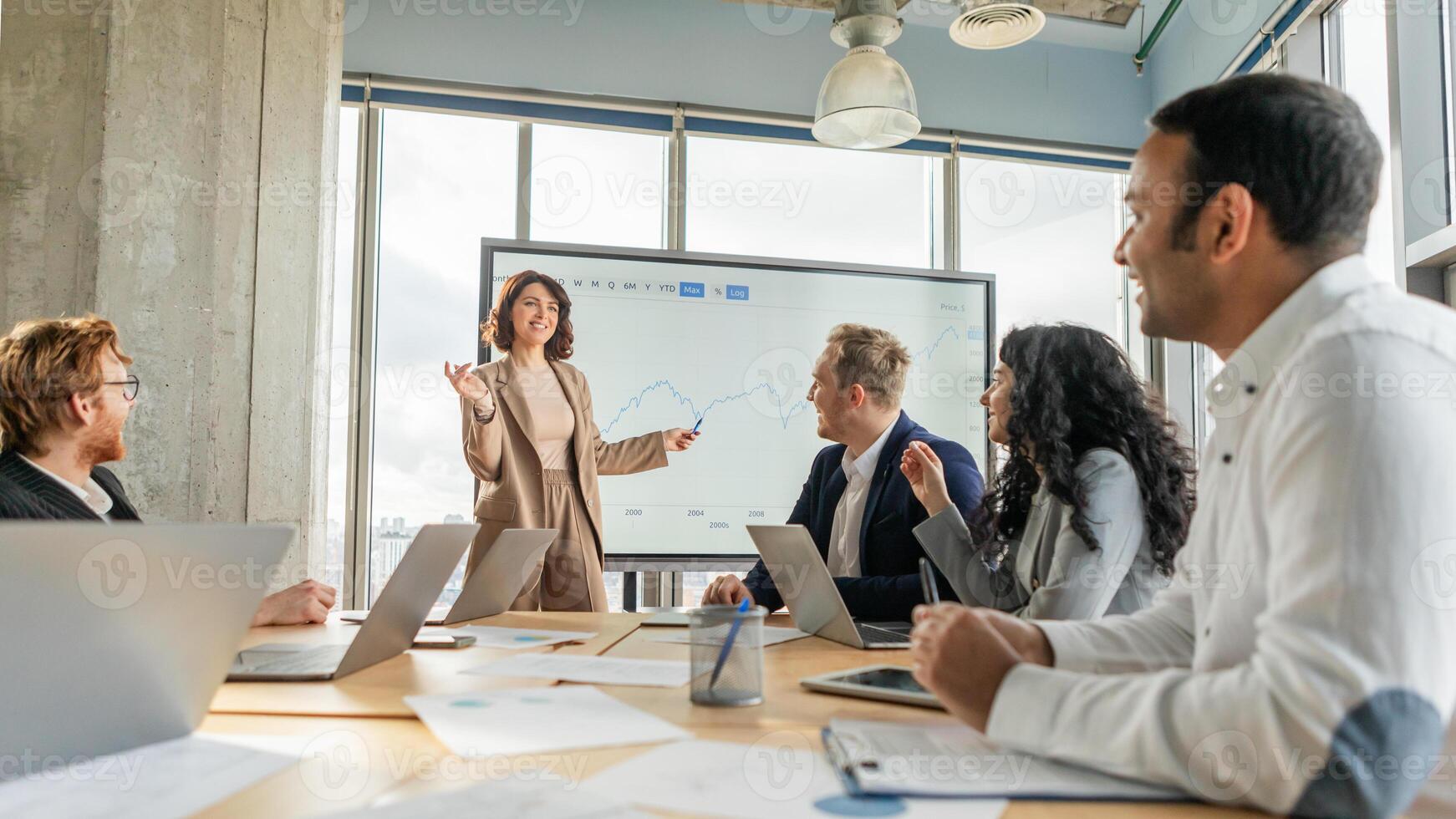 A businesswoman, standing in front of a whiteboard with a graph displayed, gestures towards the data as she presents information to a group of colleagues seated at a table in a modern office Pro Photo