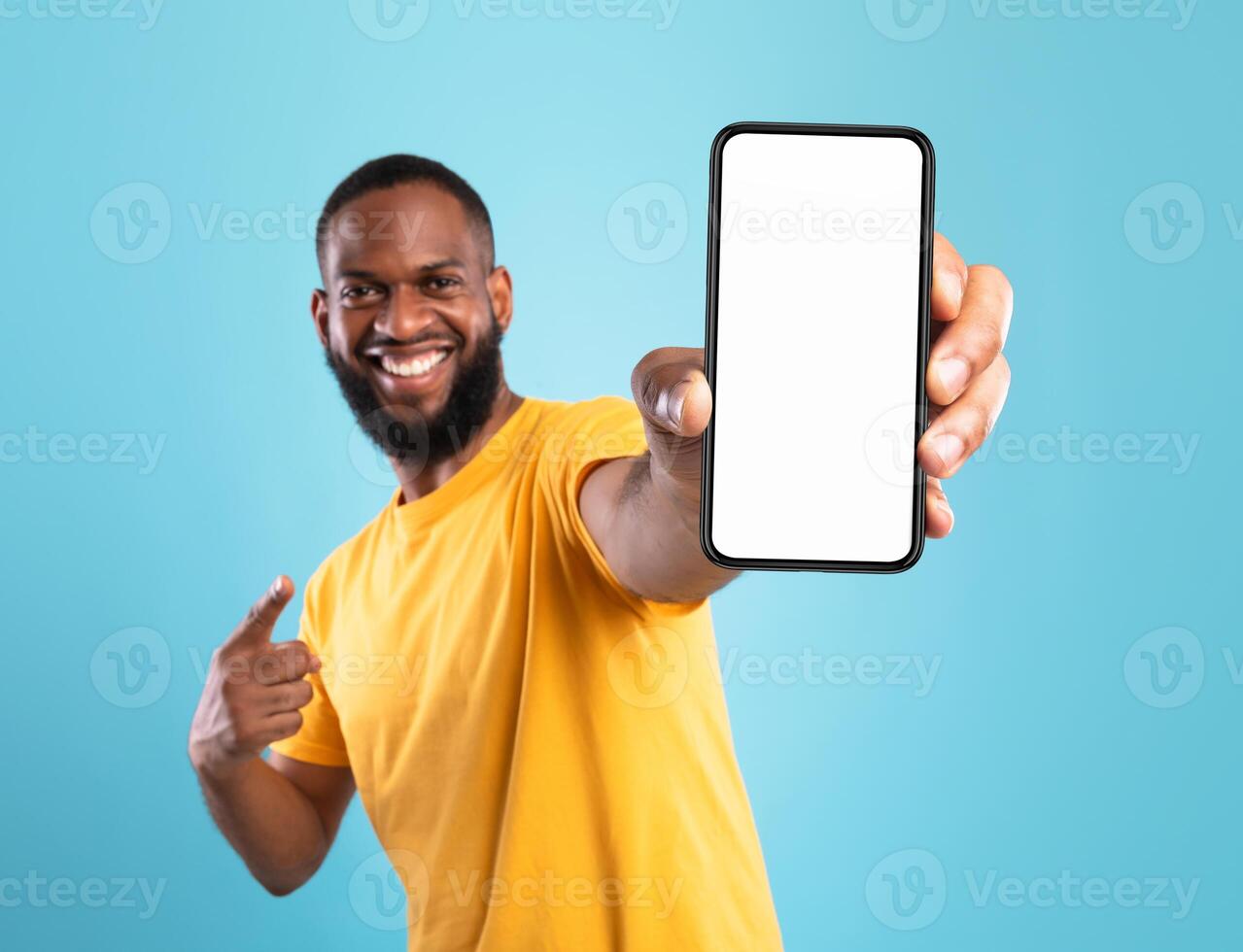 Excited black guy in casual wear pointing at cellphone with empty screen on blue studio background, space for website or mobile app design. Cellphone display mockup. Selective focus Pro Photo