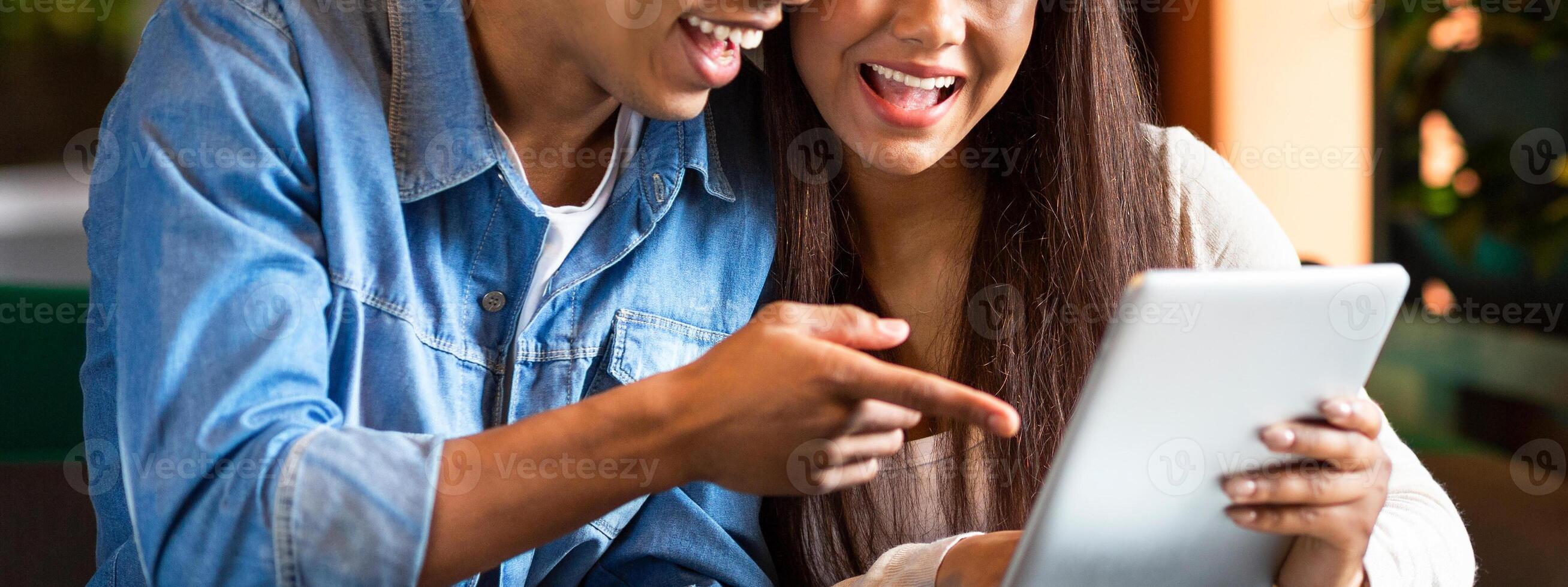 A guy and a girl are sitting together, focusing on a tablet computer in front of them. They appear engaged in the device, perhaps discussing or viewing something important on the screen, cropped Pro Photo