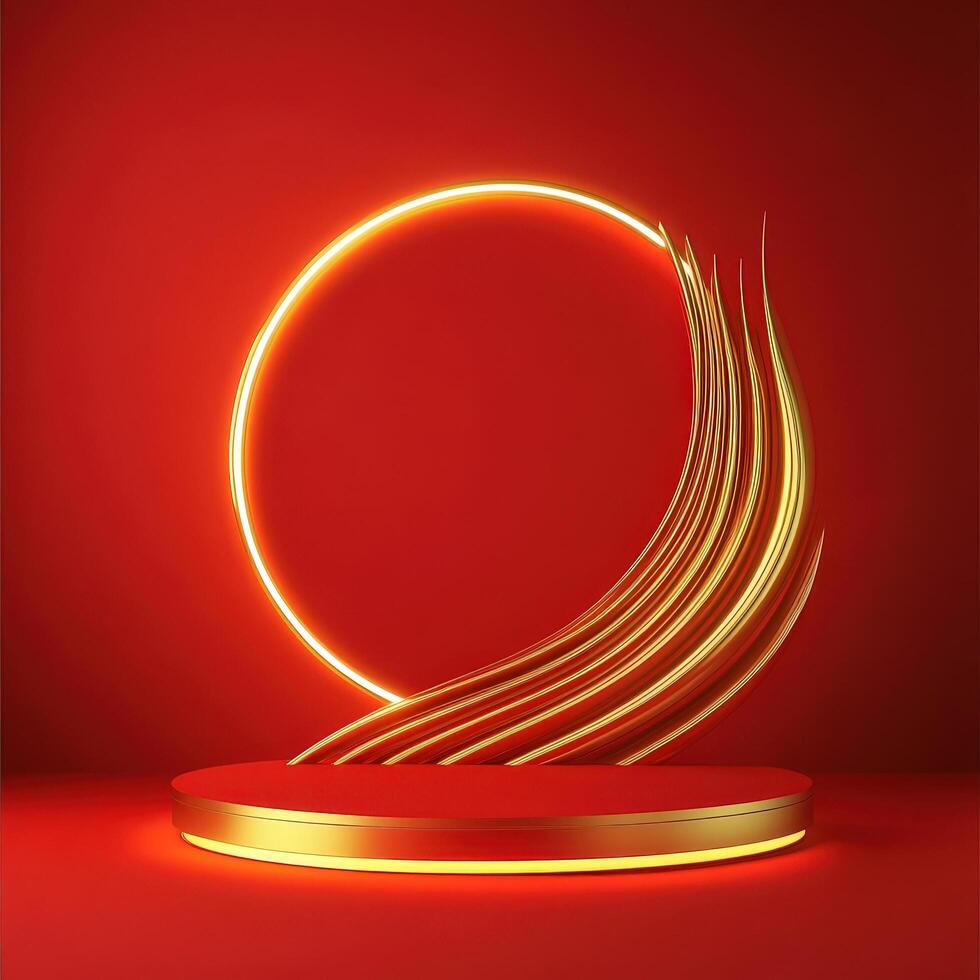 3d rendering of a red and gold round table with a neon sign Free Photo