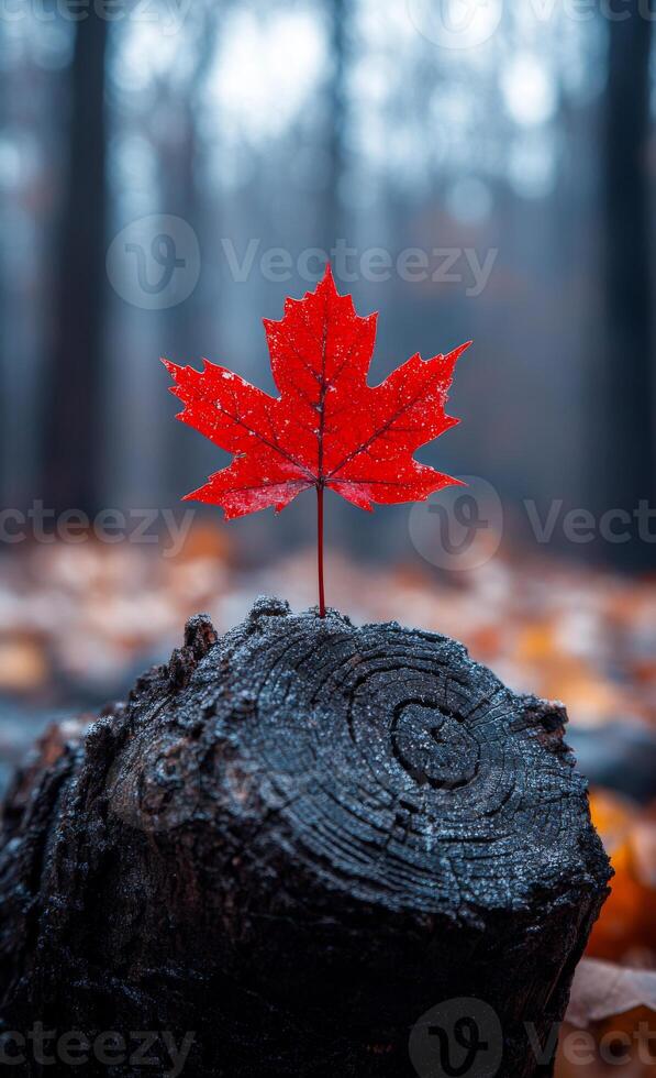 A red leaf is on top of a log. The leaf is surrounded by a dark background. Concept of solitude and tranquility, as the leaf stands alone on the log, seemingly untouched by the world around it Pro Photo
