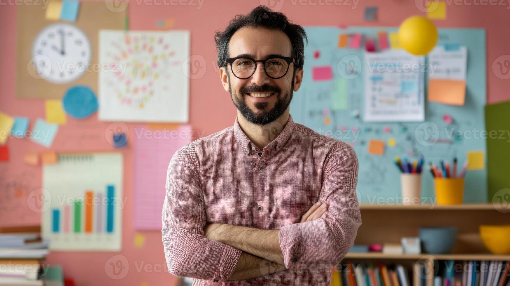 Confident Man with Arms Crossed in Front of a Wall Covered with Notes and Charts Pro Photo