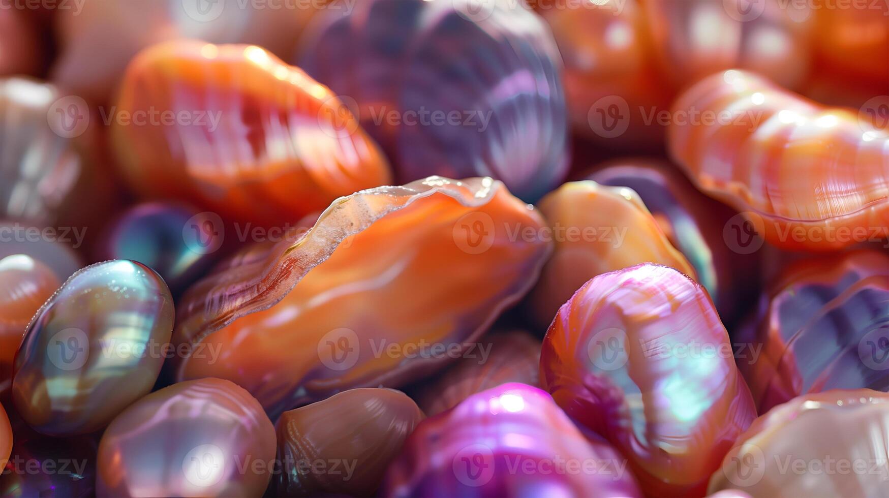 A colorful array of pearlescent shells with shimmering textures in natural light Pro Photo