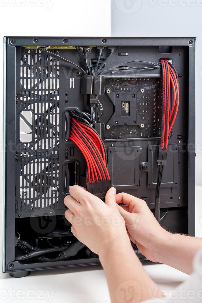 A person is carefully installing computer hardware components inside a sleek black case. The case features a glass side panel, showcasing the colorful red cables and the power supply unit visible inside. Pro Photo