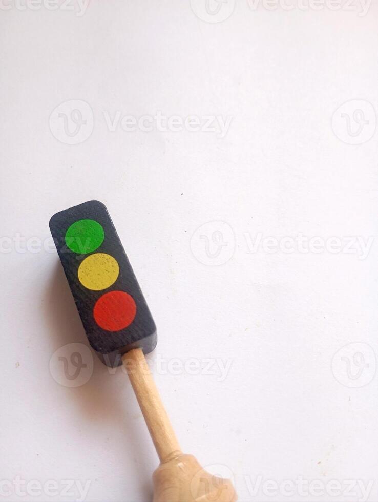 A photo of a wooden block shaped like a traffic light, styled in isolation with space for text. Pro Photo