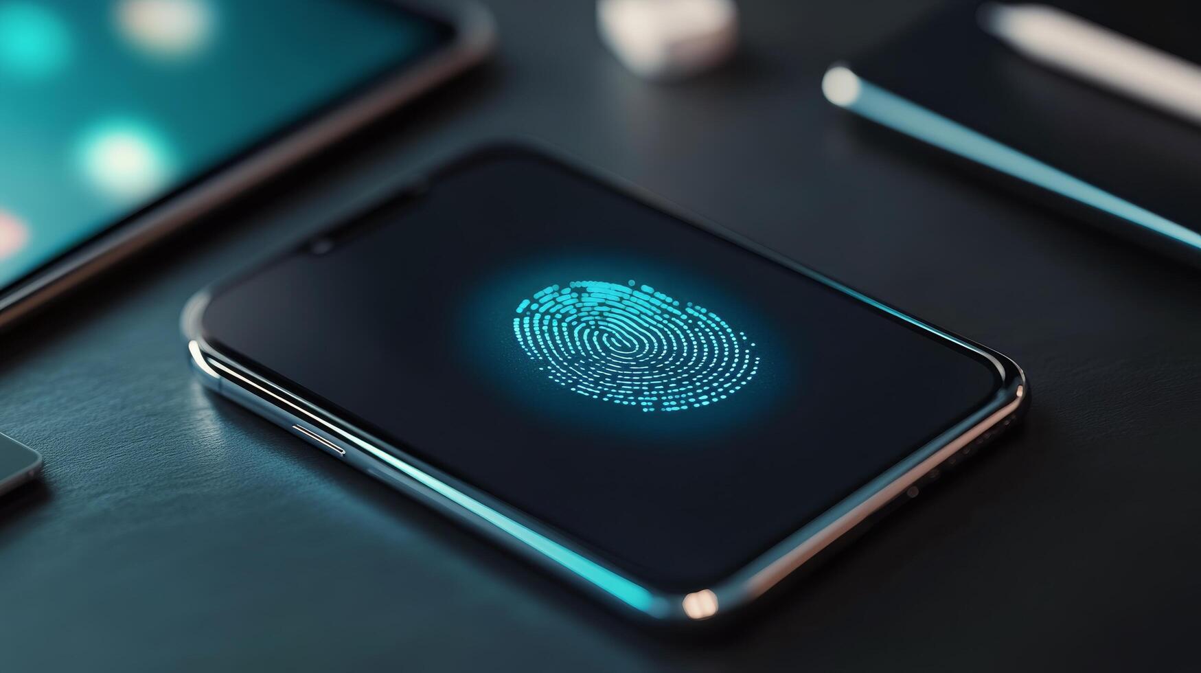 Close-up view of a smartphone displaying a blue fingerprint authentication graphic at night photo