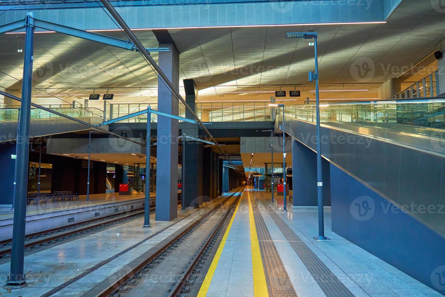 Modern train station platform with escalators and empty railway tracks. Architecture of transportation infrastructure and urban design Pro Photo