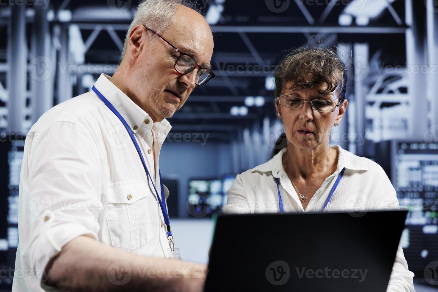 Senior employees preventing strain on data center devices caused by AI applications driving up power usage. Competent workers maintenancing server cabinets doing intense computations Pro Photo