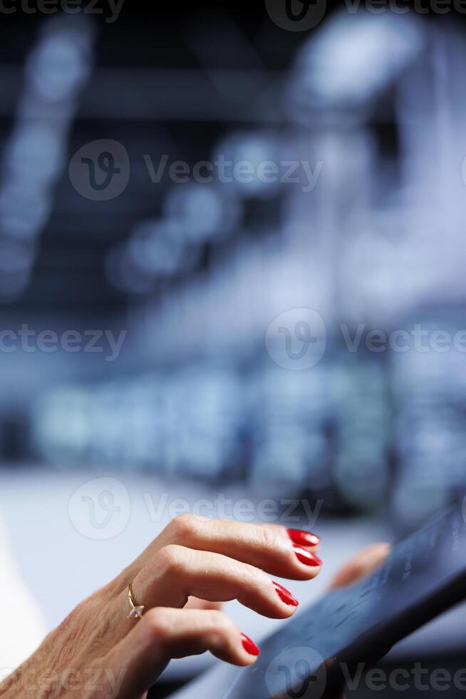 Computer scientist using tablet, ensuring valuable data remains shielded from potential risks, safeguarding server mainframes against unauthorized access and vulnerabilities, close up Pro Photo