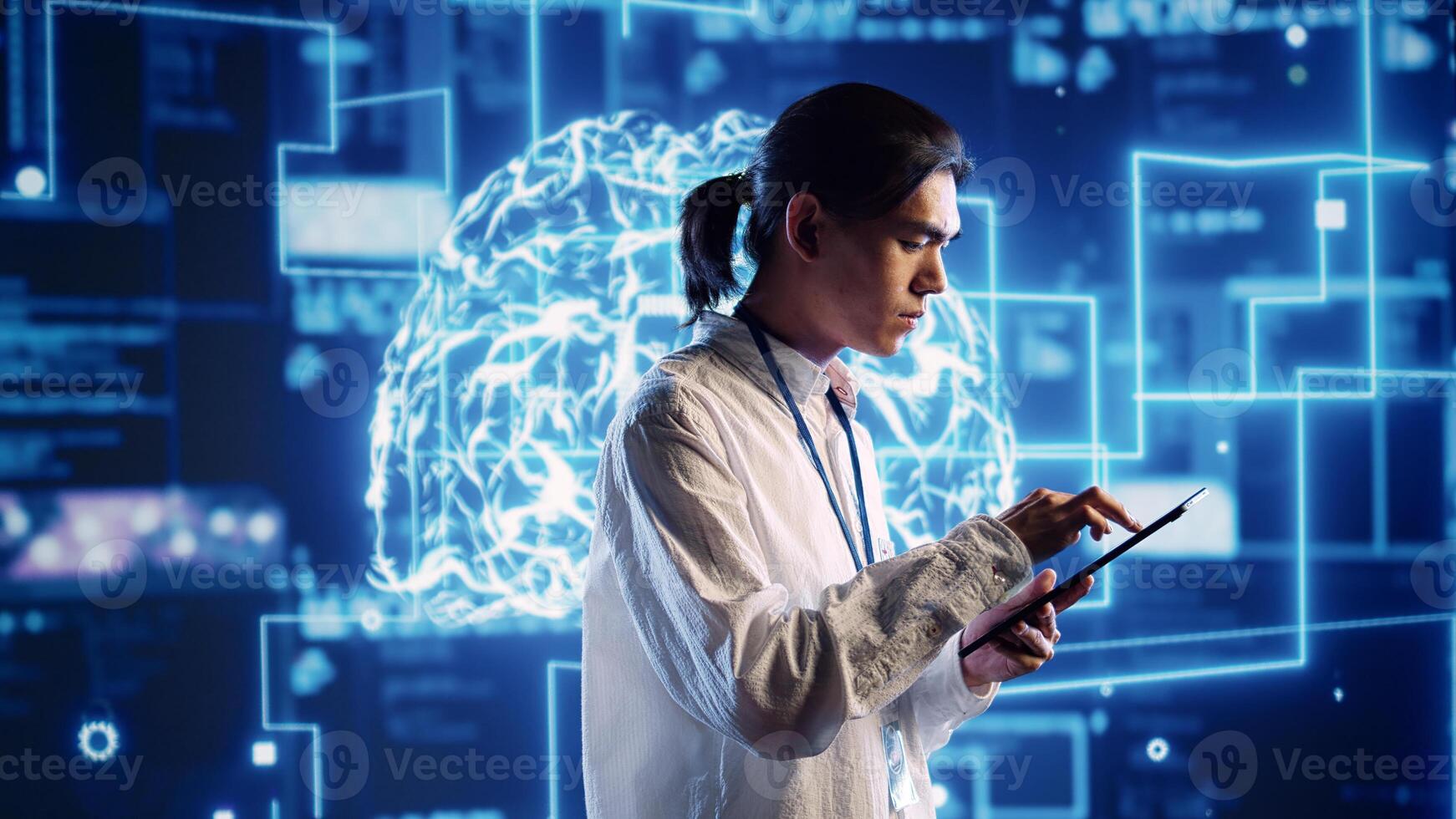 Hardworking system administrator in data center uses artificial intelligence computing simulating human brain thought processes. Server room manager works on tablet with AI machine learning algorithms Pro Photo