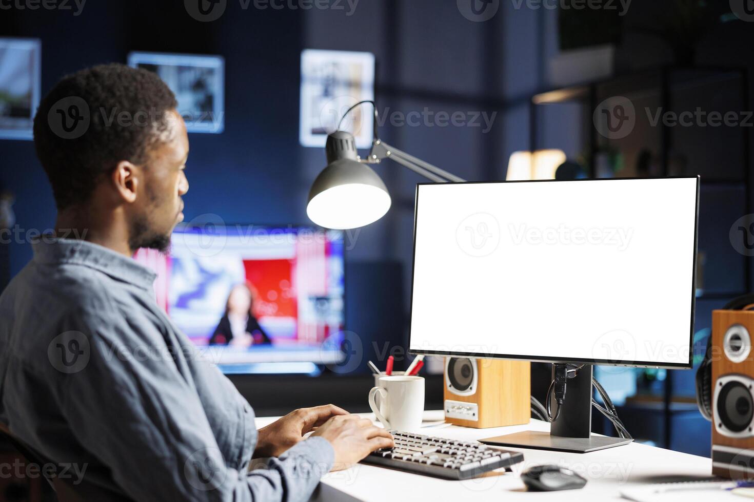 African american guy looks at white screen on monitor, working from home and using empty display on computer. Young employee does remote work with isolated copyspace layout. Pro Photo