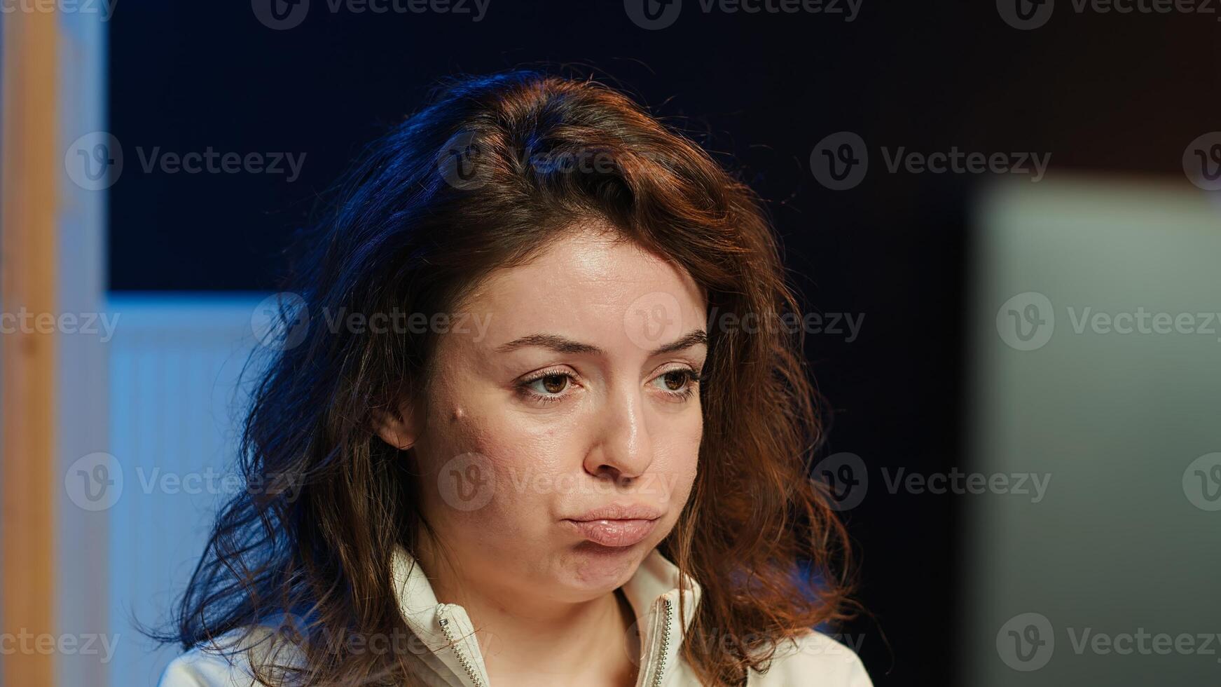 Upset teleworking engineer worried after failing to secure company servers from virus attacks, close up. Anxious woman stressed about being unable to build firewalls protecting data, camera A Pro Photo