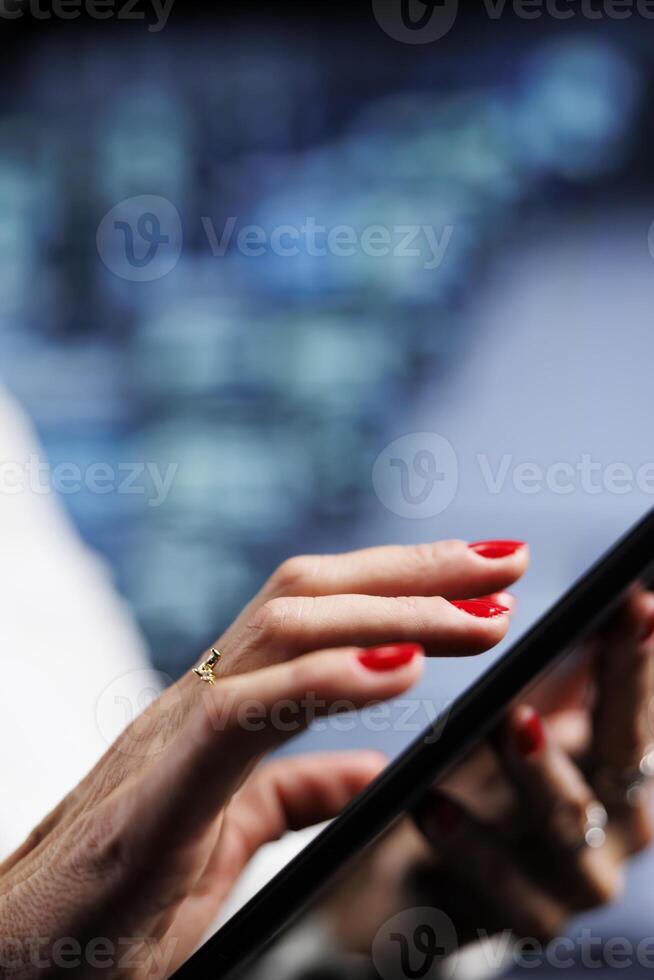 Computer scientist using tablet to make sure valuable data remains shielded from security hassles, safeguarding high tech workspace servers against unauthorized access and vulnerabilities, close up Pro Photo