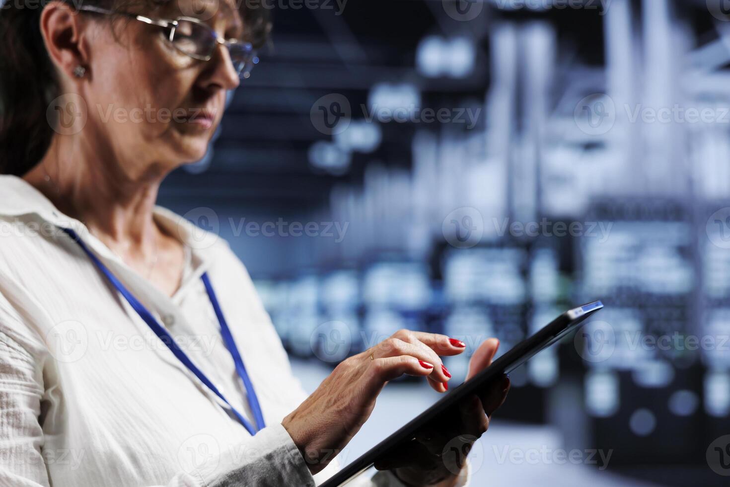 Aged IT professional using tablet, ensuring valuable data remains shielded from potential perils, safeguarding server racks against unauthorized access and vulnerabilities, close up Pro Photo
