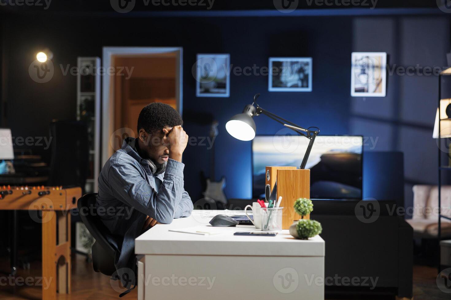 Sleepy african american person dealing with burnout while he works from home, trying to solve business tasks with global internet statistics. Self employed guy being tired at his workstation. Pro Photo