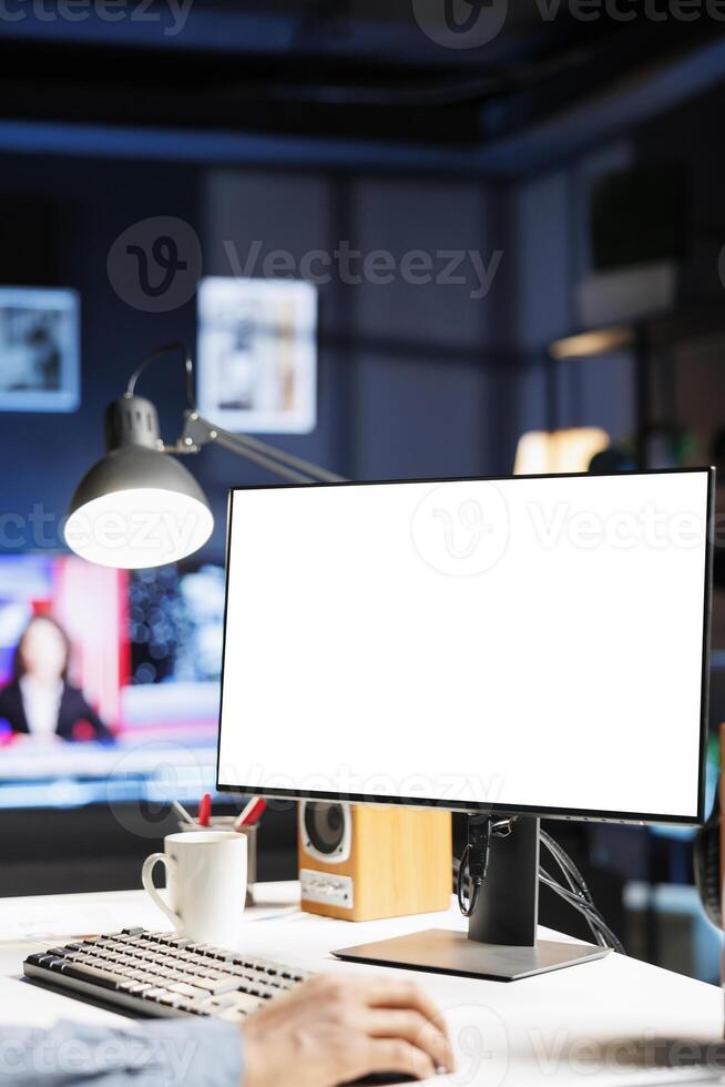 Remote worker looking at white template on pc monitor, sitting at home and using empty computer layout screen. African american freelancer checks isolated blank display at his workstation. Pro Photo