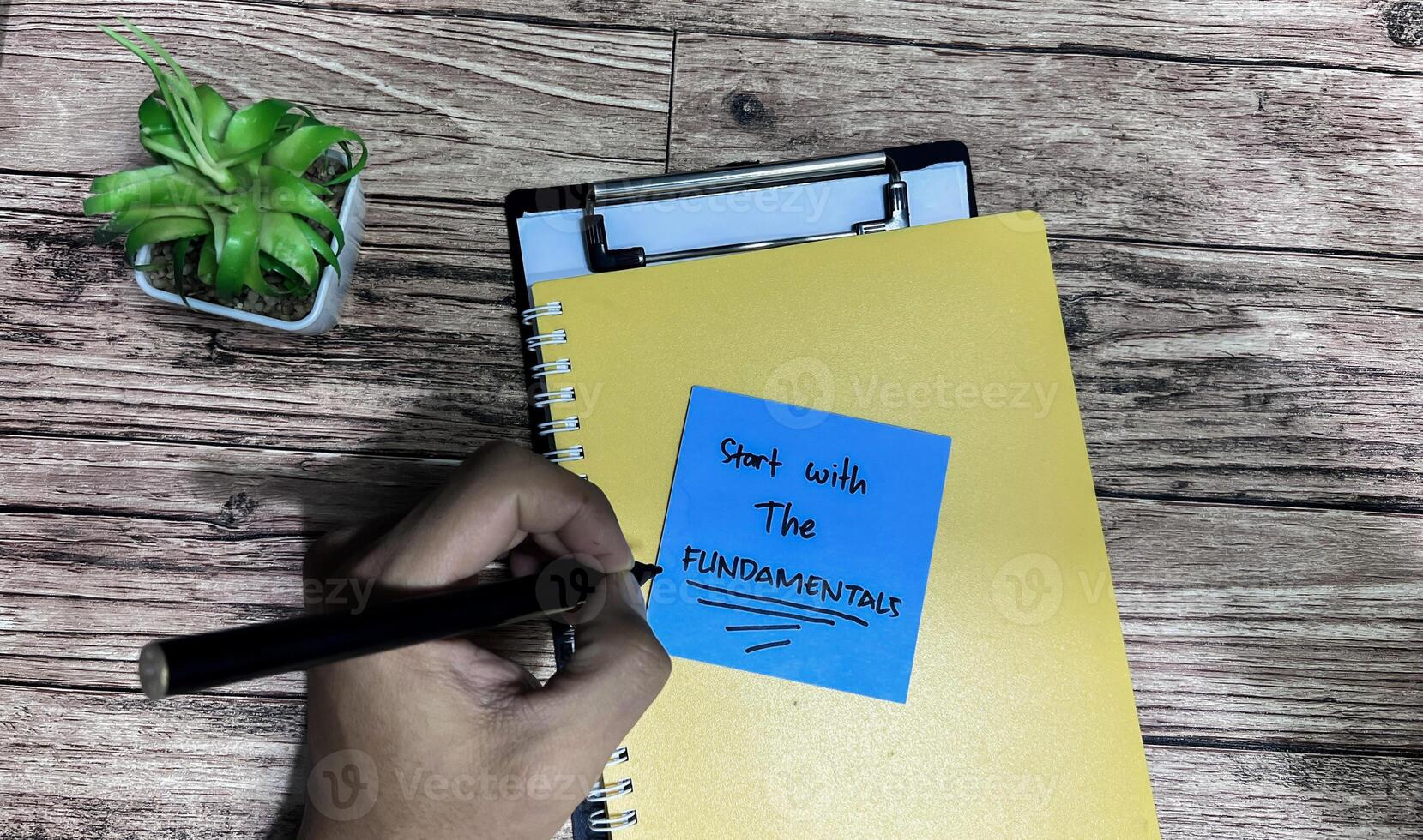 Concept of Start with the Fundamentals write on sticky notes isolated on Wooden Table. Pro Photo