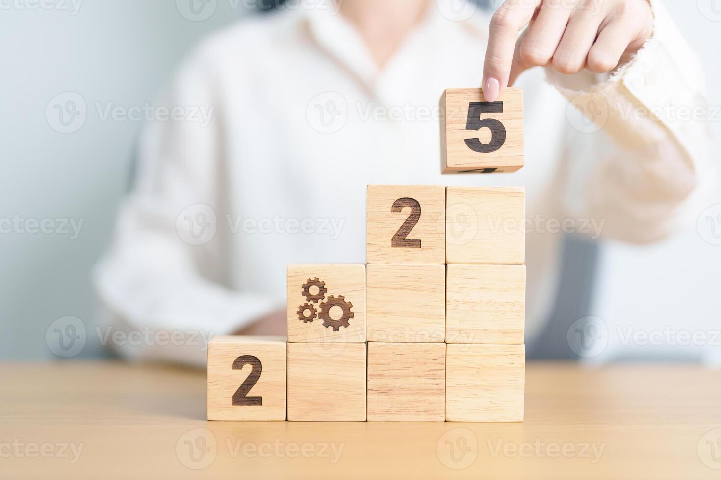 2025 year block with gear icon. Business Process, Team, teamwork, Goal, Target, Resolution, strategy, plan, Action, motivation, change, brainstorm and New Year start concepts Pro Photo