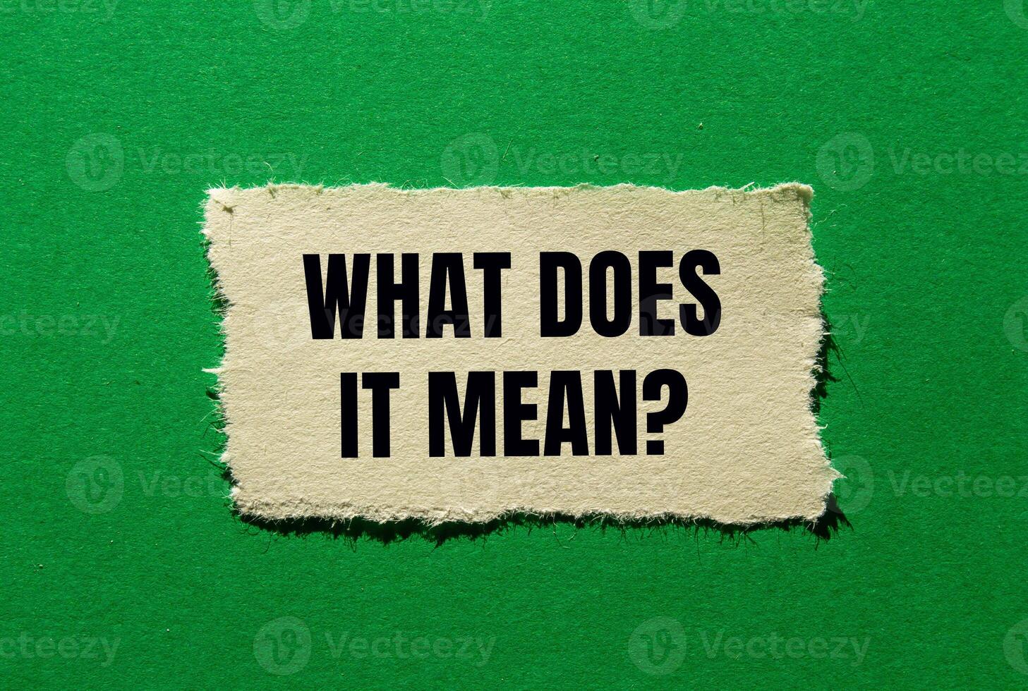 What does it mean question written on ripped torn paper piece on green background. Conceptual what does it mean question symbol. Copy space. Pro Photo