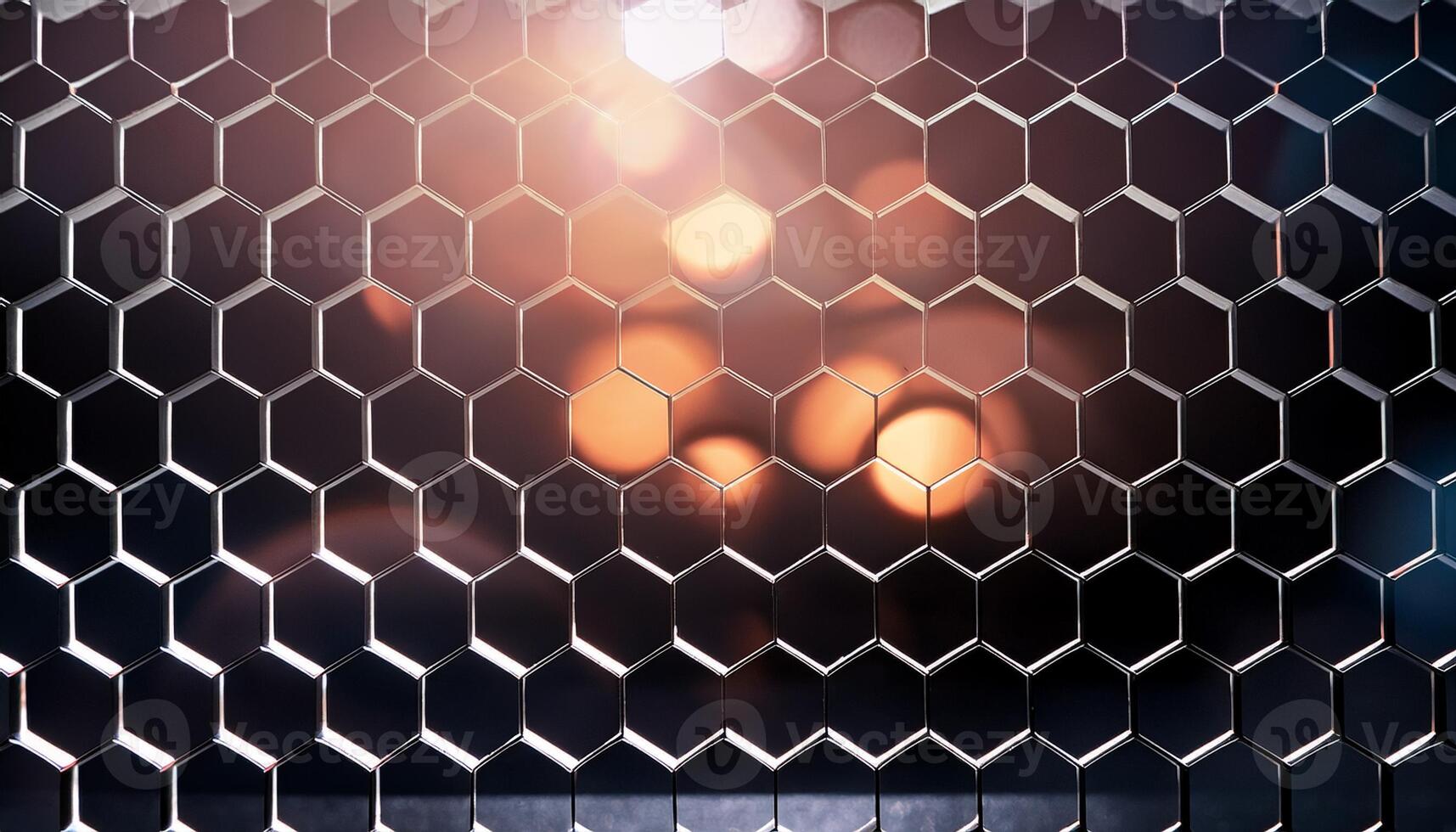 Close-up of a hexagonal grid structure with soft glowing bokeh lights in the background, creating a modern, abstract design. Pro Photo