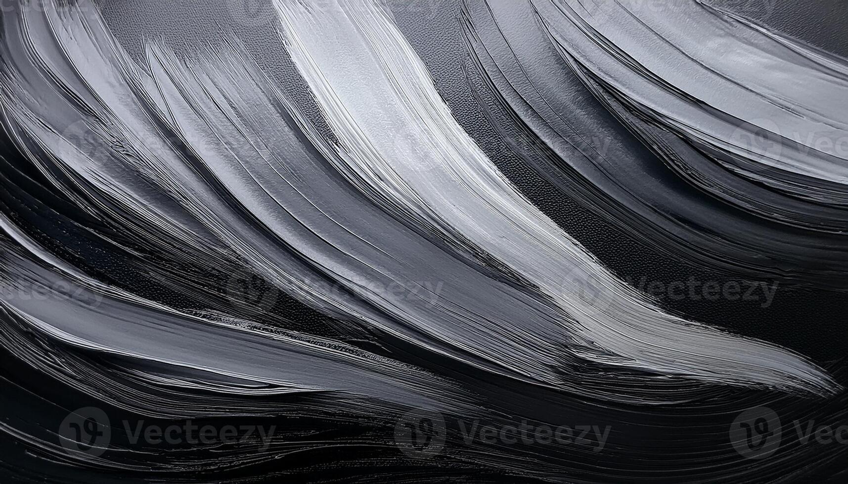 Close-up of bold black and white paintbrush strokes on canvas, creating a textured abstract pattern with flowing motion. Pro Photo