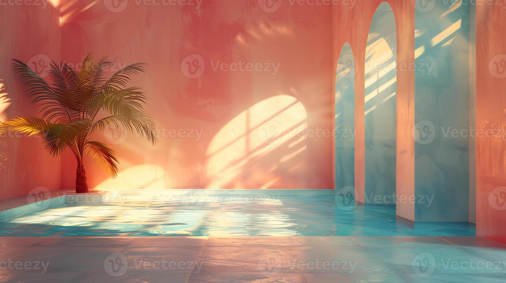 Stylish room with soft pastel walls shadows of palm trees cast across the surface sunlight streaming in creating an aesthetic modern display scene perfect for product placement Pro Photo