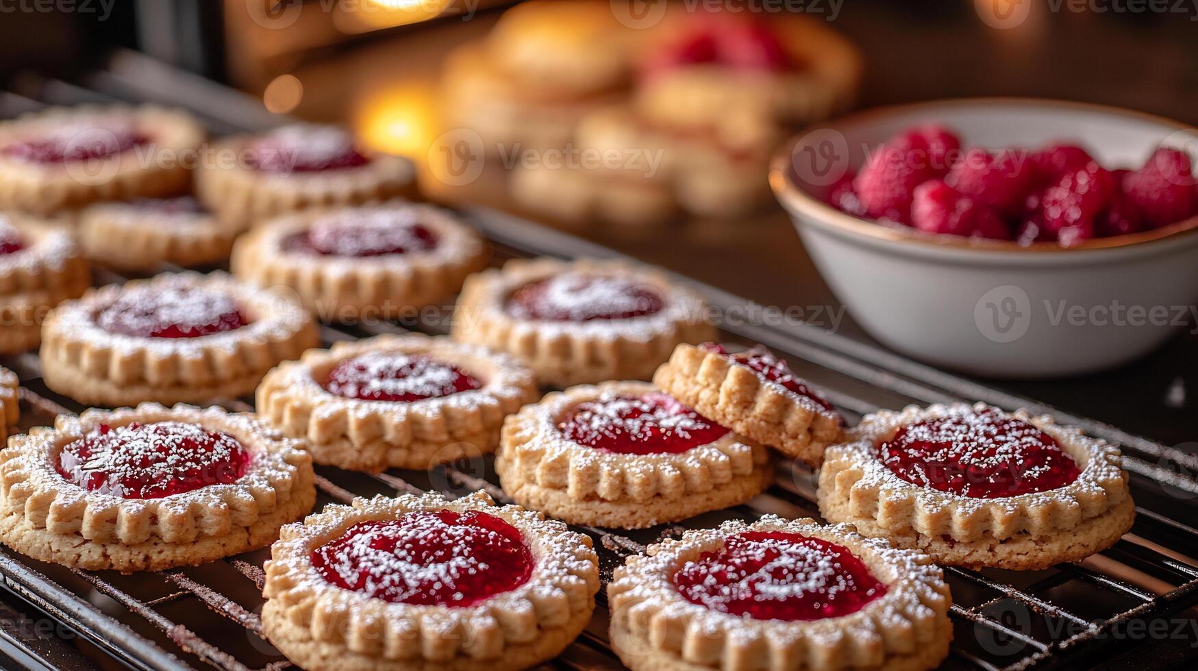 Sweet raspberry linzer cookies cooling the oven surrounded by a bowl of raspberry jam and powdered sugar creating a delicate and fruity dessert perfect for festive gatherings Pro Photo