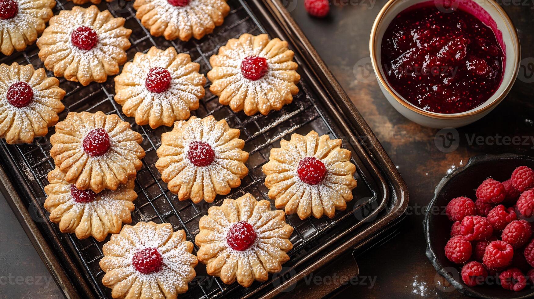 Oven a batch of sweet raspberry linzer cookies and a bowl of raspberry jam and powdered sugar on the side Pro Photo