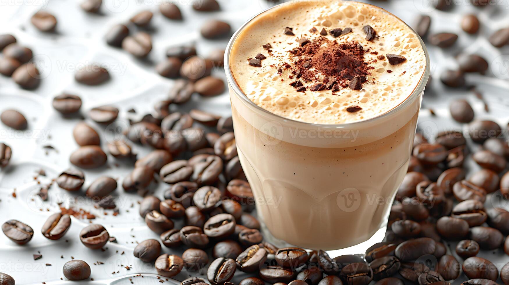 Frothy Oat Milk Latte Cocoa A creamy oat milk latte topped with a sprinkle of cocoa and surrounded by aromatic coffee beans for an inviting presentation Pro Photo