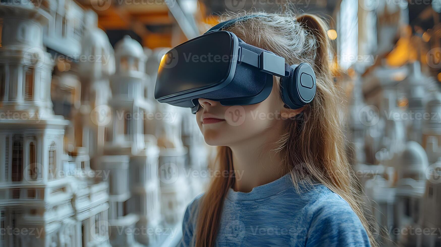 Virtual reality education setup with a student exploring a 3D model while wearing VR goggles, futuristic setting Pro Photo