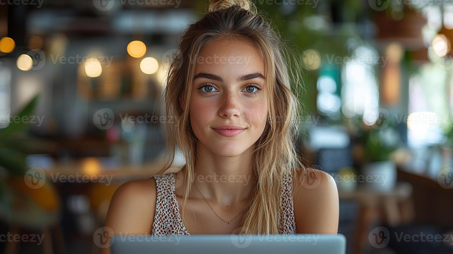 Realistic depiction of a female student using a laptop in a bright and open coworking space, wide-angle half-body view from the front, eyes locked on the camera, capturing the professional environment Pro Photo