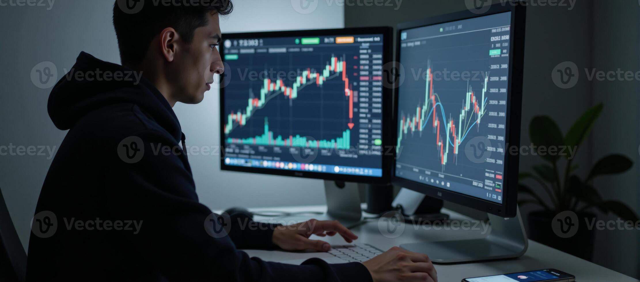 A hooded hacker performs stock analysis at his computer with market data displayed on a nearby phone Pro Photo
