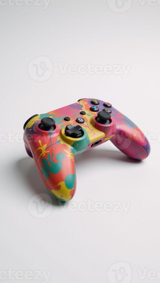 A vibrant colorful game controller stands against a pristine white backdrop Pro Photo