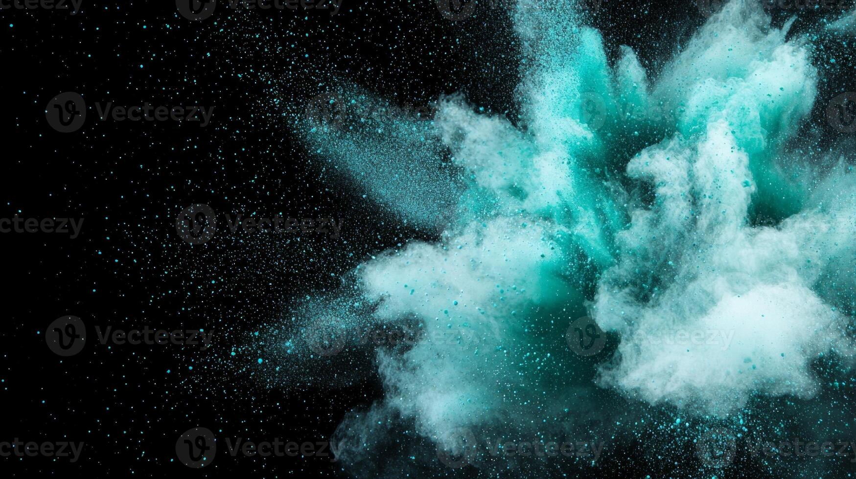 An extraordinary explosion of turquoise particles emerges, radiating outwards dynamically against a black background, creating a mesmerizing cosmic effect of light and energy. Pro Photo