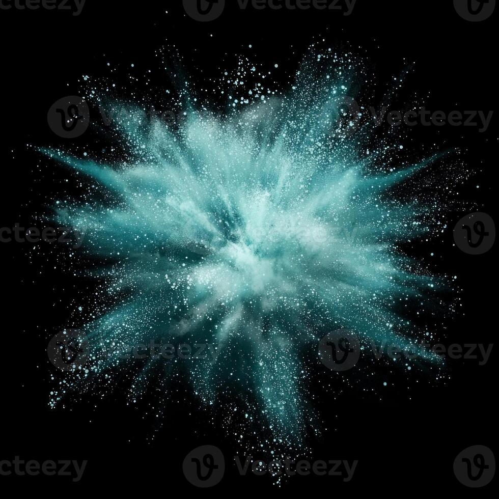 A stunning burst of turquoise particles dynamically explodes from a radiant core, dispersing energetically in all directions, set against a dark background. Pro Photo