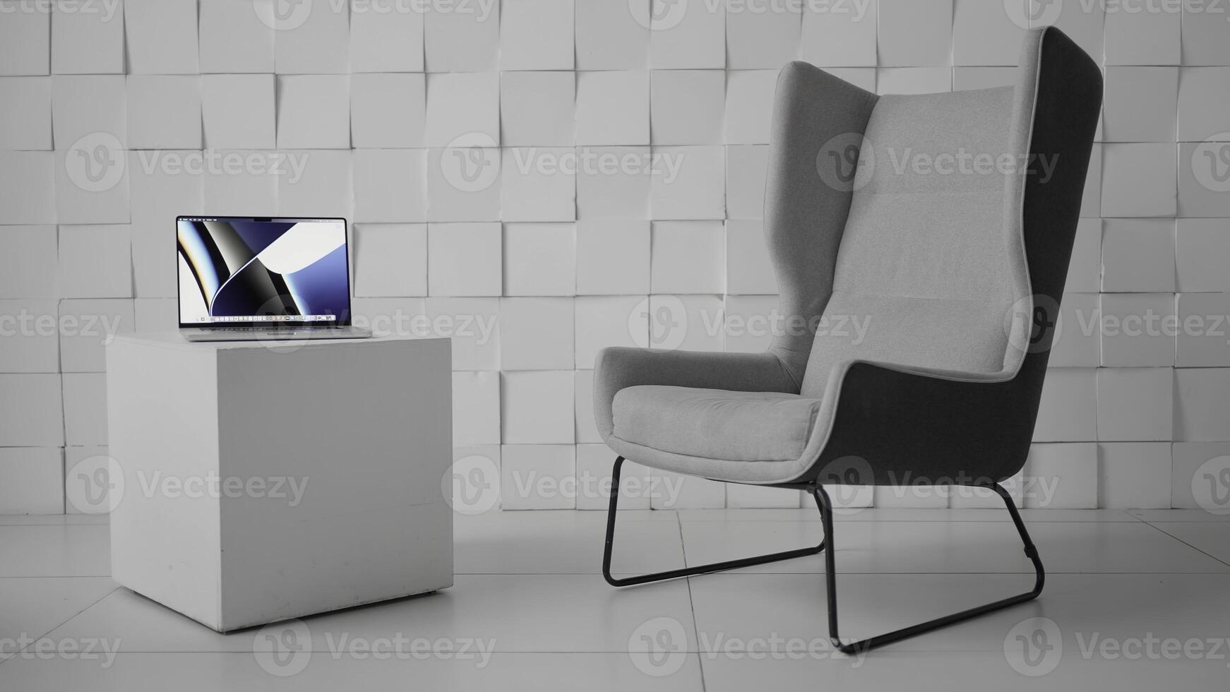 Laptop on a cubic shaped coffee table in a modern office. Action. Minimalistic design of the room with a comfortable chair and a computer on a small table. Pro Photo