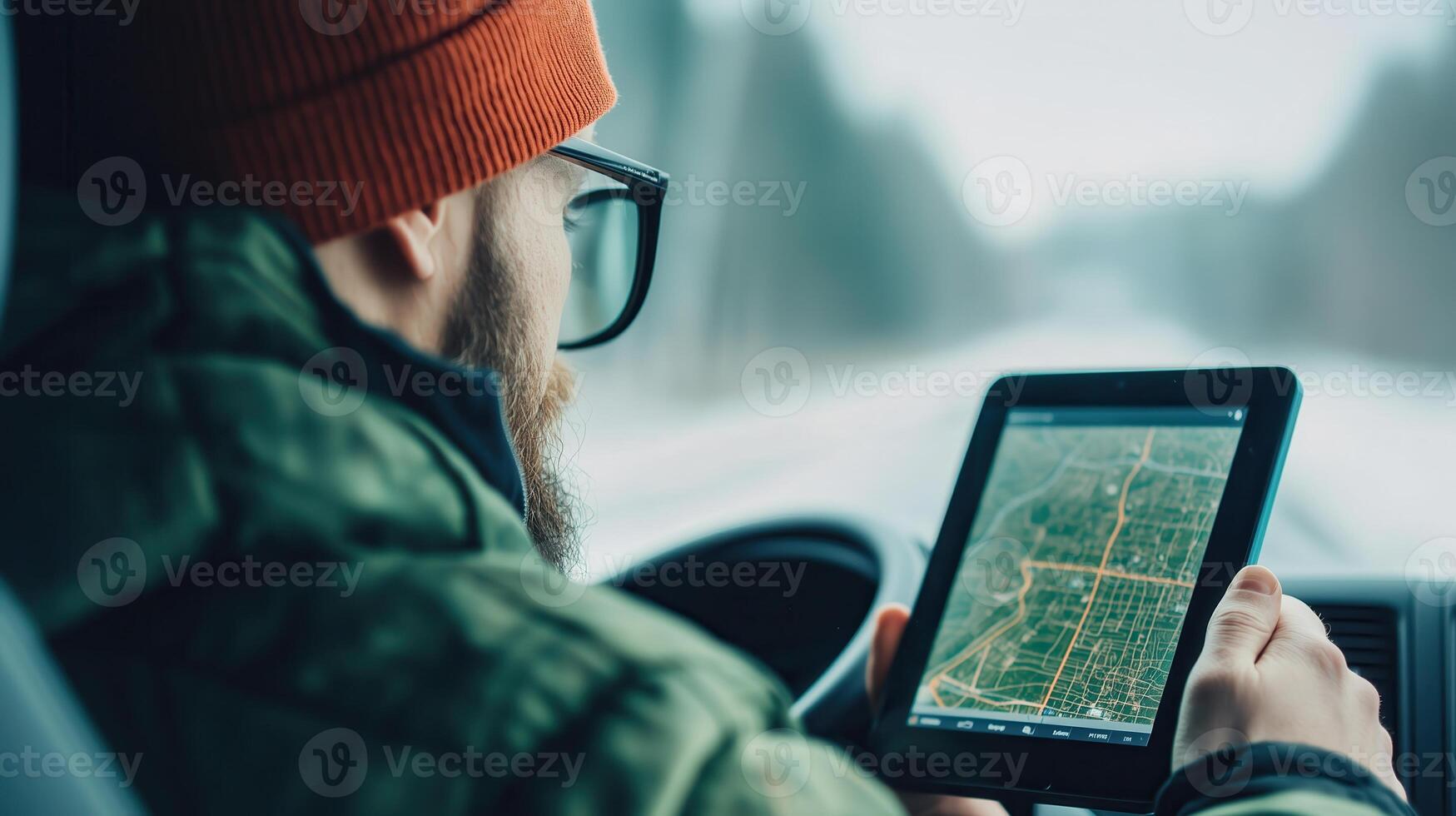 A person using a tablet for navigation while driving in a snowy environment. The focus is on the digital map displaying the road ahead. Pro Photo
